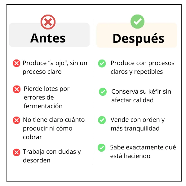 En menos de una semana, tendrás claridad sobre tiempos de fermentación, conservación, cantidades y costos, lo que te permite producir kéfir estable y listo para vender desde tu próximo lote, sin improvisar ni perder producto.